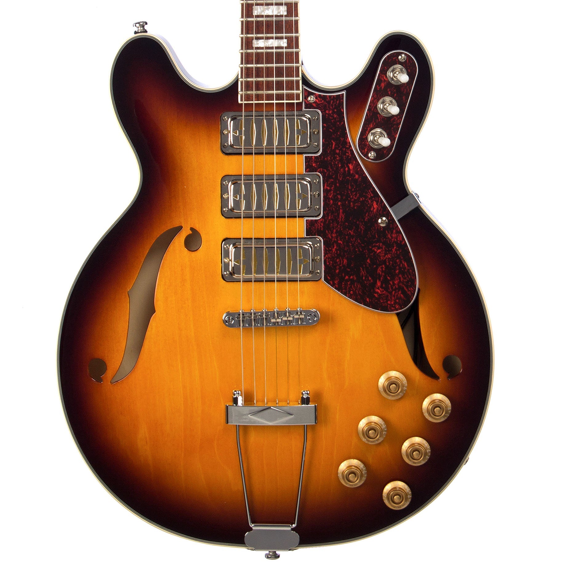 Now with upgraded electronics including Push/Pull Tone Controls for a wide variety of Full Humbucking and Split sounds. Take your guitar playing to the next level with the Airline H77. Paying tribute to the vintage 1960's models, this semi-hollow electric guitar boasts modern upgrades like humbucking Gold Foil Argyle pickups (splittable) and a center block for improved playability, tone, and resistance to feedback. From the beautifully arched top and back of its laminated Maple body, to the rich finish, to the authentic retro-style appointments and hardware, this beauty looks nearly identical to the guitars that inspired it, but it plays even better! Get that vintage vibe with authentic appointments in a new and improved package!